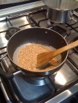As rain beat down heavily outside and Bujji slept longer than usual, making the most of the cozy weather, we suddenly hit upon the idea of making Sunnundalu – delicious laddoos made with just 3 ingredients in under 20 minutes. We started by dry-roasting urad dal in a kadhai on a medium flame until it turned slightly brown. The trick to knowing when to stop is not in the colour but in the aroma of freshly roasted dal, which, mingled with the scent of rain to create a heady mix. Once the dal was done, we added grated jaggery to it and ran the mixture in the blender until it turned into a grainy powder. Warm, melted ghee was then poured into the mixture to make about 12 regular sized, hand-rolled laddoos. After the traditional offering to the Gods which was our way of thanking Him for the belated April-showers, we hurriedly enjoyed this wonderful sweet. The laddoos can also be stored in an air-tight container for upto a week – if one can manage to make them last that long!!
